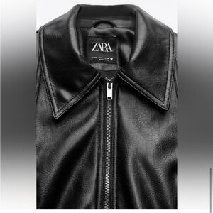 Contemporary faux leather jacket by Zara. Front zip closure and pointed collar. Vertical zip pockets for clean lines. Smooth, glossy finish for a sleek look. Easy to style from casual to refined. Like new. Worn only once. Perfect condition. Size M is great as an oversized fit for people who are usually XS or S.