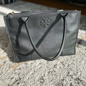 Structured leather tote with dual top handles. Zip-secured compartments for organization. Embossed Tory Burch logo on front. Polished gold-tone hardware accents. Versatile everyday carry, perfect work bag!