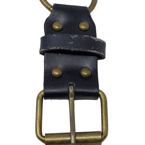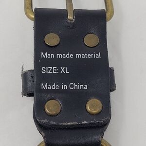 This belt has a story to tell, adorned with brass studs and a unique design that harkens back to days of old. Crafted from man-made materials, it adds a touch of rugged elegance to any ensemble, perfect for those who cherish both style and history.