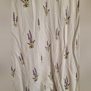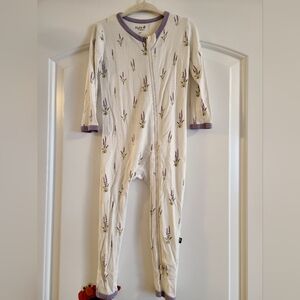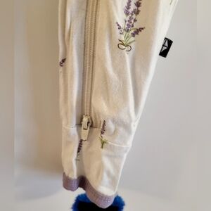 Kyte Baby soft cream one-piece with lavender sprig print. Comfortable bamboo fabric and gentle stretch for easy movement. Zip front with ankle zippers for quick changes. Lavender trim adds a sweet finish.