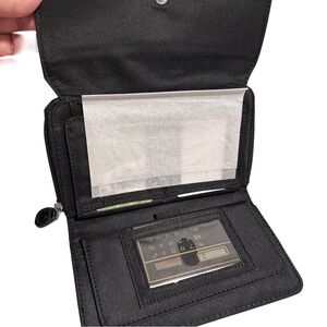 Slim black wallet organizer. Built-in calculator visible inside. Clear ID window and multiple slots for cards. Zippered compartment for coins or small items. Simple and practical design.
