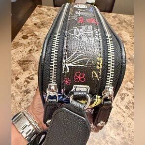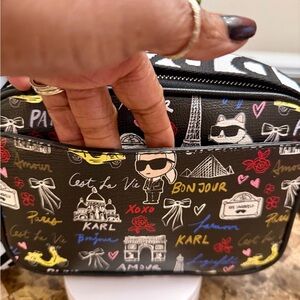 "Black Multi" Paris-themed print with various Karl Lagerfeld icons, including the designer himself, his cat Choupette, and French landmarks like the Eiffel Tower. Double zip camera bag silhouette with a "Paris" logo web strap. Adorned with colorful graphics, including the "Karl" signature, bows, and "Amour" and "Bonjour" text.
