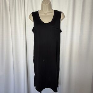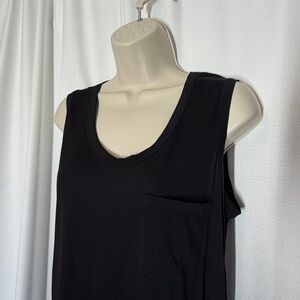 • Features: Scoop neck midi length sleeveless T-shirt dress with single chest pocket and side slits. Slightly sheer. See photos.