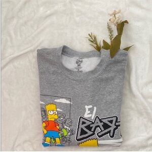 Grey crewneck sweatshirt featuring The Simpsons Bart Simpson graffiti graphic. Soft, casual sweater with bold red and multicolor print. Comfortable everyday layer in grey for fans of The Simpsons.