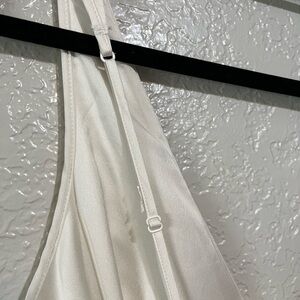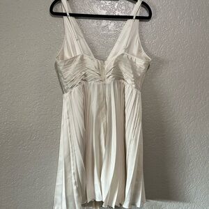 Beautiful Abercrombie & Fitch satin mini dress in a soft ivory/cream shade. Features a deep plunge V-neckline, sleeveless silhouette, empire waist, and flowy pleated skirt. The satin fabric gives it an elegant, luxe look while the mini length keeps it flirty and feminine.