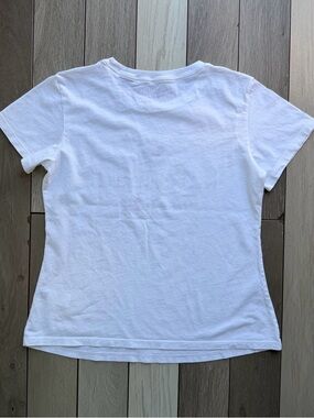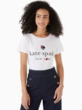 Kate Spade short-sleeve tee in crisp white. Features signature logo print with subtle pink accents. Soft, breathable fabric for everyday comfort. Clean crew neckline and a relaxed, flattering fit.
