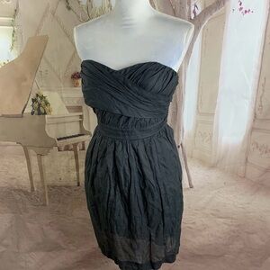 Elegant J. Crew strapless dress with a sweetheart neckline. Fitted bodice with ruched detail. Defined waist and gently pleated skirt. Classic black for evening wear.