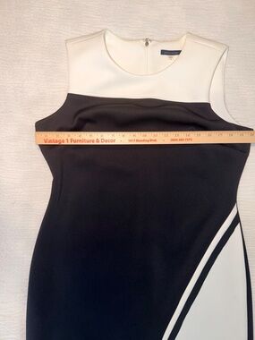 Timeless black and white sheath dress featuring a sleek, modern colorblock design. The tailored, straight silhouette creates a refined and polished look without clinging, offering effortless sophistication for work or special occasions.