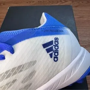 Brand new Adidas X Speedflow.3 TF turf soccer cleats in a bold blue and white colorway. Designed for speed and agility on turf surfaces, these are lightweight, responsive, and super comfortable.