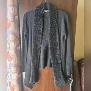Chic black cardigan with soft fuzzy trim. Ideal for layering and adding elegance. size medium. a bit of pilling on the fabric.
