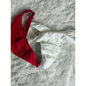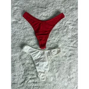 NWOT Maidenform thong panties bundle including one red and one white pair. Very soft, stretchy cotton-feel material with classic minimal coverage styling. Great everyday basics and perfect for bundle purchases.