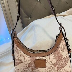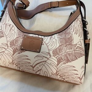 Tommy Bahama shoulder bag with cream background and brown leaf print. Brown trim and adjustable strap. Zip-top closure for security. Subtle branded plaque on front.
