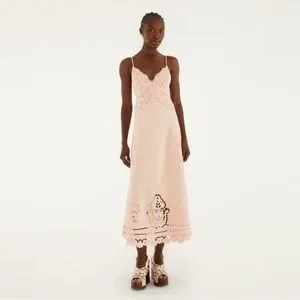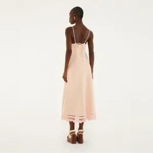 Bask in effortless charm with the Pink Richelieu Euroflax™ Premium Linen Slip Midi Dress by FARM Rio. Crafted from breathable premium linen, this dress boasts a delicate pink hue adorned with intricate Richelieu embroidery, adding a touch of artisanal elegance. Its graceful sweetheart neckline and fluid midi silhouette celebrate femininity with playful sophistication, perfect for sunny days or whimsical evenings.