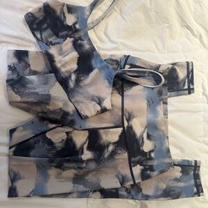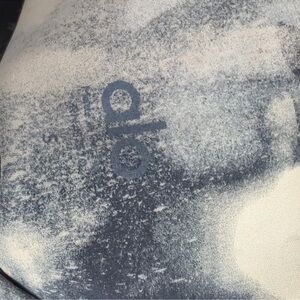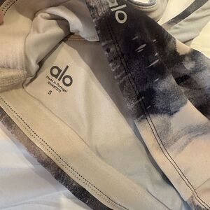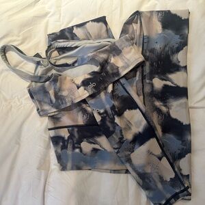 Two-piece ALO Yoga activewear set. Soft neutral base with black tie-dye detailing. Smooth, stretchy fabric for movement. Sleek, minimalist logo branding. Versatile for workouts or casual wear.