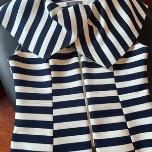 Navy and white striped peplum top by Gracia. Features a wide, structured collar. Front zipper closure. Feminine, flared hem.