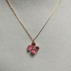 Delicate gold-tone necklace featuring a pink enamel flower pendant with center crystal detail. Feminine, minimal design that works well for everyday wear or layering. Finished with a lobster clasp closure.