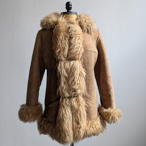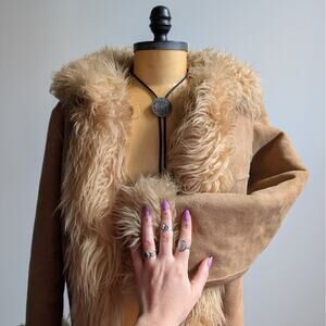 OMG!! Insanely gorgeous vintage genuine suede penny lane afghan coat! Major 70s almost famous boho chic does 90s minimalist princess vibes. Sexy shaggy fur trim with cozy warm full shearling lining. Neutral earth tone tan brown cream colorway. Unique two tone silver chain and gold clasp front closures. Pockets! Mid - heavy weight. Hits upper thigh on 5’4 model. Minor faded spots and scuffs consistent with age. Gently used, in very good vintage condition.