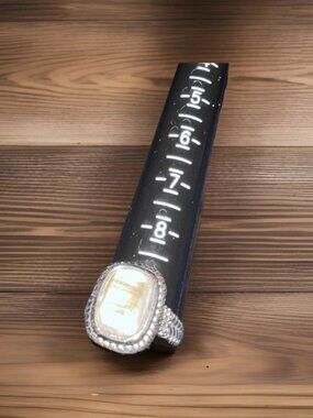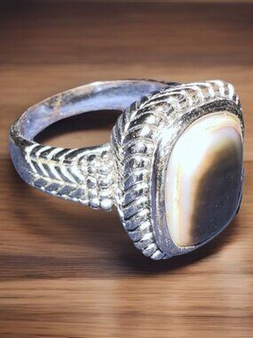 This beautiful ring features a smoky opal stone set in a silver band. The ring size is 9.5 and it has a beaded rectangular border that adds a unique touch to the design. The ring is perfect for those who love simple yet elegant jewelry pieces. The silver tone color gives it a timeless look that will match any outfit. The ring is in great shape and ready to be added to your collection.