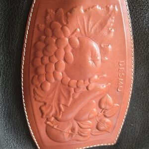 Spacious tote bag in black leather with brown leather trim. Features an embossed brown leather patch with fruit motif. Versatile and stylish everyday carry. Clean, classic design.
