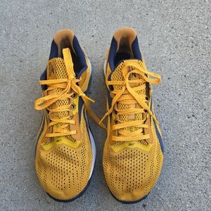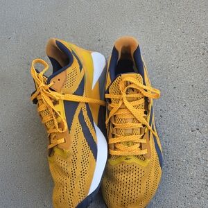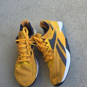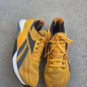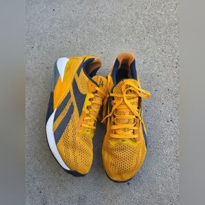 Reebok Nano X1 training sneaker in the "Semi Solar Gold" yellow and navy blue colorway feature a durable Flexweave knit upper and Floatride . Breathable upper for airflow. Responsive cushioned sole for comfort. Sporty silhouette for daily wear. Has wears but in good shape. Clean. Comfortable. Men's size 13. Retails $159