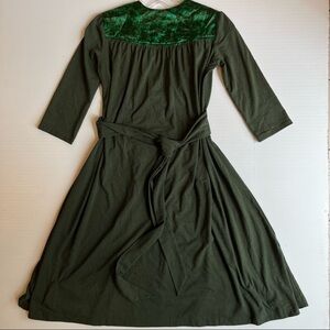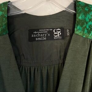 Unique and artsy, this Zachary's Smile dress was made exclusively for Barneys New York CO-OP. The rich olive green jersey knit is complemented by satin-like green trim at the shoulders and waist, creating textural contrast and a flattering silhouette. Features a plunging V-neckline, 3/4 length sleeves, elasticized waist, and a flowy midi-length skirt with matching belt for adjustable fit.