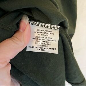 Material: 60% polyester, 32% rayon, 8% spandex (exclusive of trim). Made in Canada.