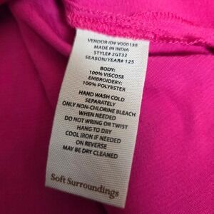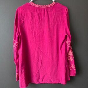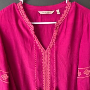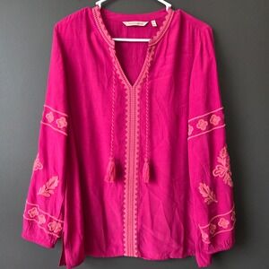 Soft Surroundings embroidered tunic top in a vibrant magenta pink hue offers a relaxed, bohemian-inspired silhouette. Crafted from a lightweight, textured viscose fabric, it features intricate floral and geometric embroidery along the split V-neckline, center front, and voluminous long sleeves. The neckline is accented with delicate braided ties and tassels, while the elasticized cuffs and side-slit hem enhance its comfortable, breezy fit.