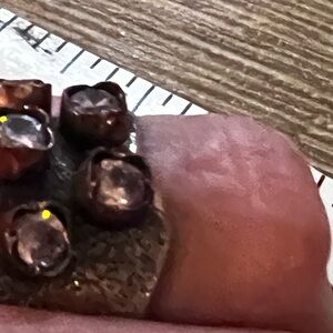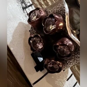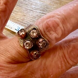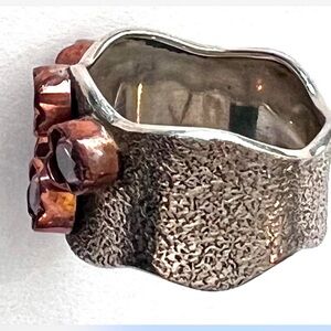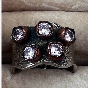 Elegant silver ring with copper accents and sparkling gemstones. Perfect for adding a touch of sophistication to any outfit.