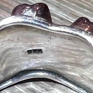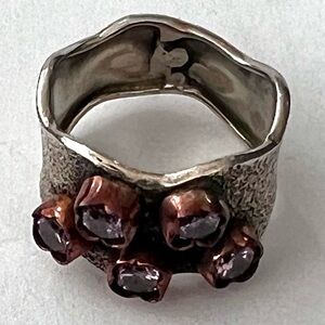 handmade brutalist-style statement ring, crafted from sterling silver with copper accents raised settings for light purple gemstones, which are probably amethyst or garnets but not real sure if stones.