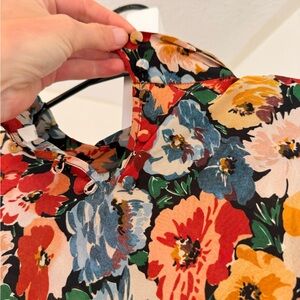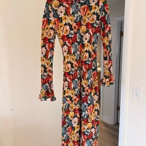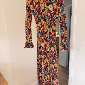 Long-sleeve floral maxi with a flowing silhouette. Bold multi-hued blooms on a contrasting background. Soft drape and feminine flair. Versatile for daytime or evening wear.