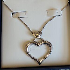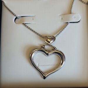 Timeless open-heart sterling silver necklace .. Features a small heart accent above a larger open heart pendant for layered visual appeal. Lightweight and versatile design for everyday or dressy looks. Includes silver color and subtle romantic detail.