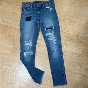 Skinny women's jeans in a medium blue wash. Distressed detailing with stitched patch accents. Classic five-pocket styling and frayed hem. Contemporary slim fit for everyday wear.