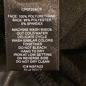 Sanctuary, black faux, leather leggings, size small. Made in China, machine washable. In excellent used condition. Pockets in the back, see photos. Face 100% polyurethane, back 95% polyester and 5% spandex, see photo of tag. Elastic waist measures 13 1/2 inches across, rise is 10 inches and inseam is 27 inches.