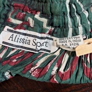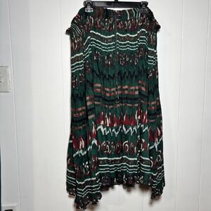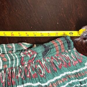 Alissia Sport vintage maxi skirt features a vibrant green base with an intricate southwestern tribal print in red, white, and black. Crafted from 100% cotton in India, this piece showcases a crinkled broomstick texture and an elastic drawstring waist accented with beaded bell tassels. The flowing silhouette and earthy color palette make it a versatile staple for bohemian or eclectic styling.