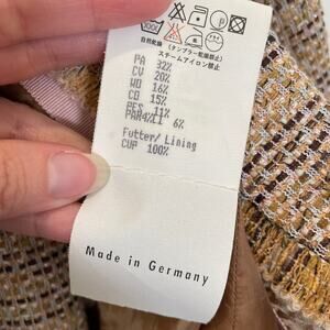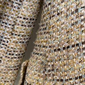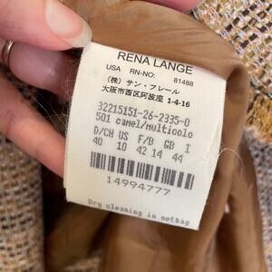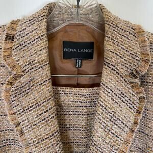 Beige, black and white tweed skirt suit with fringe detailing and clear sequins accent, by Rena Lange. Two-button blazer, faux flap pockets. Straight skirt silhouette with back pleat. Overall very good pre-owned condition: some very slight pilling in a few areas of the sleeves - very hard to notice at all, but full disclosure (see pic #10). Fabric is a combination of wool, cotton, acrylic, polyester, nylon and polyamide. Bust across the front area of jacket measures approx. 19 inches.