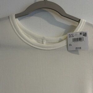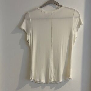 Classic cream/white short sleeve crewneck top. Soft, lightweight fabric for everyday comfort. Versatile style that pairs easily with jeans or skirts. Clean silhouette with subtle ribbed detailing at the shoulders. Easy-care and wardrobe-friendly.