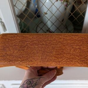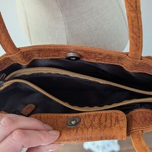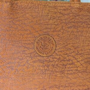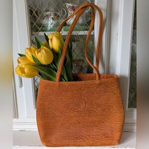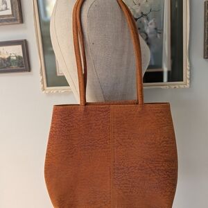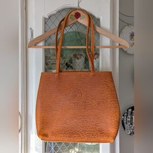 A timeless tote crafted in a rich burnt orange brown leather look material. Features sturdy double shoulder straps and a simple embossed elephant logo detail. Clean, versatile silhouette ideal for everyday use. Very clean, almost like new. Not sure if it's real leather, outter is stuff with a soft touch.
