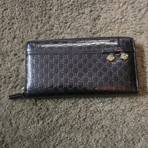 Gucci embossed patent leather zip wallet. Glossy black finish with subtle GG monogram. Gold heart zipper pulls for a chic touch. Sleek and stylish everyday accessory.