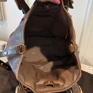 Interior: lined with large zipper pocket, top snap closure and leather strap that allows sides to be polled inward if desired.