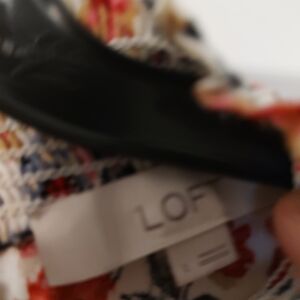 Lightweight LOFT blouse with an all-over floral print. Cream background with red and navy floral details. Short puff sleeves with smocked cuffs. Rounded neckline with gentle gathers. Easy, flowy silhouette for everyday wear.Size Large