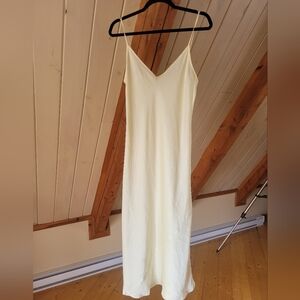 Satin midi slip dress in a light yellow. Has a small stain on the back (see photos). Size medium. Laid flat the dimensions are 50 inches long and 14.5 inches wide. adjustable straps. :)