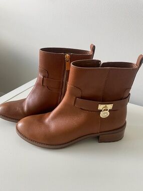 Beautiful leather tan booties with zipper and logo. Slightly above ankle. Very stylish and versatile with business and casual outfits.