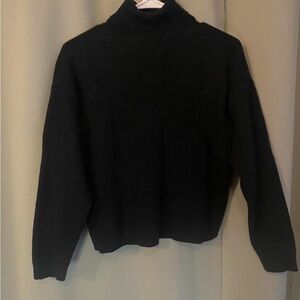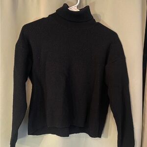 Soft black turtleneck sweater by J. Crew. Fine knit with a clean, streamlined shape. Comfortable for layering or worn alone. Timeless wardrobe staple. Made from merino wool