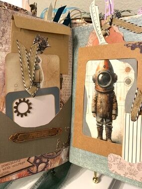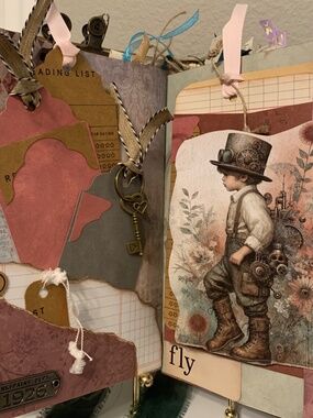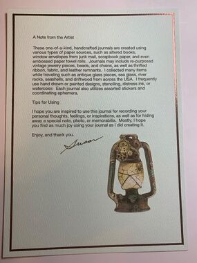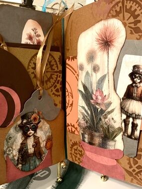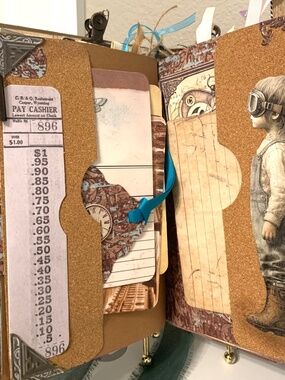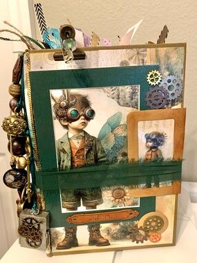 This handcrafted, one-of-a-kind steampunk inspired artistic junk journal measures 9 1/2 high, x 8 wide, x 5 deep and contains 32 inside pages. The spine displays a decorative brass ball, brass steampunk pendant, wood and glass beads, brass heart lock, steampunk metal box locket, skeleton key, resin steampunk charm, and two brass bulldog clips. The back pocket incorporates a zipper pocket. Inside includes many bookmark/hang tags, tuck pockets, mini booklet, pages for notations/journaling, ribbons, key charms, hidden paperclip, magnifying glass window, a giant paper clip, and coordinating steampunk inspired ephemera.