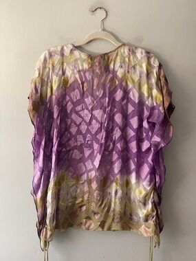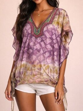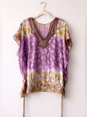 Gorgeous Hale Bob silk blend tunic featuring a vibrant watercolor print in purple, lavender, olive, and soft blush tones. The statement beaded neckline adds rich detail while the airy silk fabric creates a beautiful flowy drape. Adjustable side ties allow for a customizable fit. Perfect for vacation, resort wear, beach dinners, or effortless boho styling.
