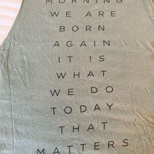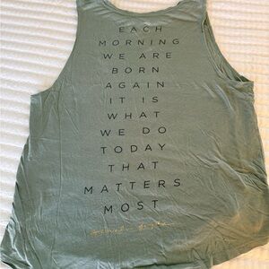 Sage green sleeveless tank by Spiritual Gangster. Lightweight, breathable fabric for all-day comfort. Small embroidered heart detail adds subtle charm along with a powerful encouraging message on the back. Easy to style for casual looks.