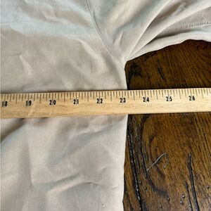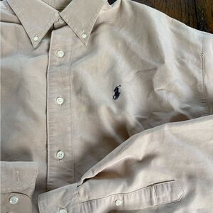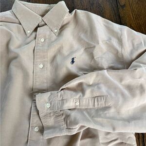 Classic Polo by Ralph Lauren button-down shirt. Features embroidered navy pony logo on chest. Soft, neutral light beige color. Clean, versatile style for casual or smart-casual wear.