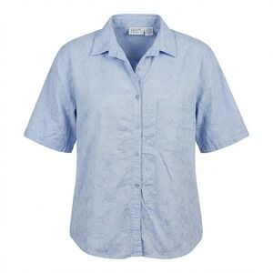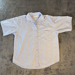 This charming vintage Honors Plus shirt comes in a soft cornflower blue and features intricate tonal embroidery throughout. Crafted from breathable 100% cotton, the fabric has a subtle textured feel with swirl and floral patterns that mimic an eyelet or damask style. The shirt is designed with a classic pointed collar, a single chest pocket, and a full button-front closure. A back box pleat with a locker loop ensures a comfortable, relaxed fit. This high-quality 90s staple is in excellent vintage condition and is perfect for a breezy summer look or a professional office ensemble.