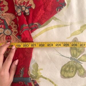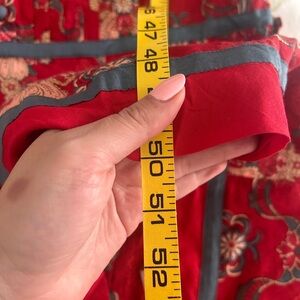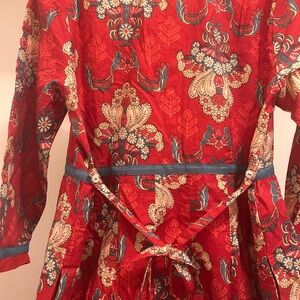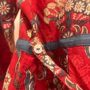 Bright red floral dress with pintuck front. Fabric-covered buttons down the center. Contrasting blue trim along neckline and hem. Lightweight cotton with detailed floral and paisley motifs. Extra fabric covered buttons and mother of pearl button.
