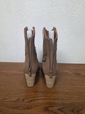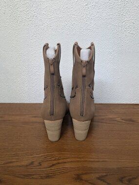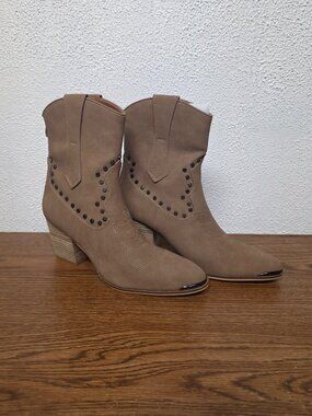 The women's CCOCCI Pandora Western Style Boots with Metal Tips and Studs in size 10 are a stylish and fashionable choice for casual occasions. Featuring a round toe, zip closure, and high block heel, these ankle boots are made from faux suede with studded accents. The brown color and Western theme make them a versatile option for fall and spring seasons. The synthetic outsole and insole provide comfort and durability, while the metal tips add a touch of edgy sophistication to the overall design. Like new. Smoke free home.